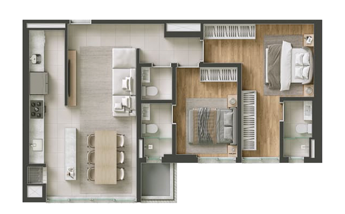 Este complexo residencial inovador foi meticulosamente projetado para harmonizar a modernidade dos espaços urbanos com a paisagem natural deslumbrante do litoral.