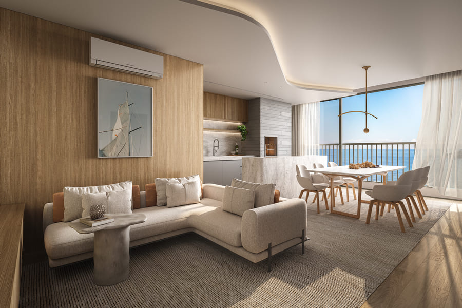 Com arquitetura inspirada nos contornos da costa e nas cores do horizonte ao entardecer, cada detalhe foi pensado para conectar os moradores com a beleza intrínseca do lugar.
